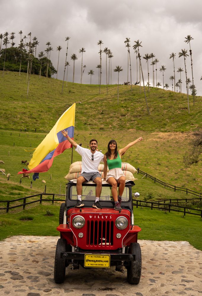 🚗 Nous avons pris un Willys en direction de la Vallée de Cocora. Le Willys est une jeep locale qui peut accueillir jusqu’à 10 personnes. Il faut prendre les tickets dans le petit kiosque sur la place principale là où sont stationnés tous les Willys. Le Willys part quand il est plein mais nous avons à peine attendu quelques minutes. Il faut compter environ une demi-heure de route jusqu’à la vallée de Cocora et le trajet coûte 8K COP (2€) aller-retour.