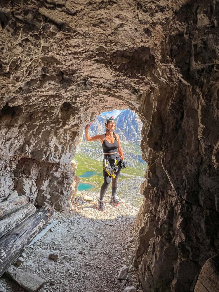 Une fois arrivé au Refuge Locatelli, il faut te diriger vers le sud (les Tre Cime derrière toi et le refuge sur ta gauche, il faudra grimper une centaine de mètres sur ta droite), direction un grand piton rocheux facilement reconnaissable, nommé Saucisse de Francfort. Une fois à proximité de ce piton, tu peux commencer à t’équiper avant de rentrer dans la première galerie. Si tu as du mal à trouver l’entrée, n’hésite pas à demander au personnel du refuge. La Via Ferrata étant assez populaire, il ne fait nul doute que d’autres grimpeurs pourront également t’indiquer le chemin.
