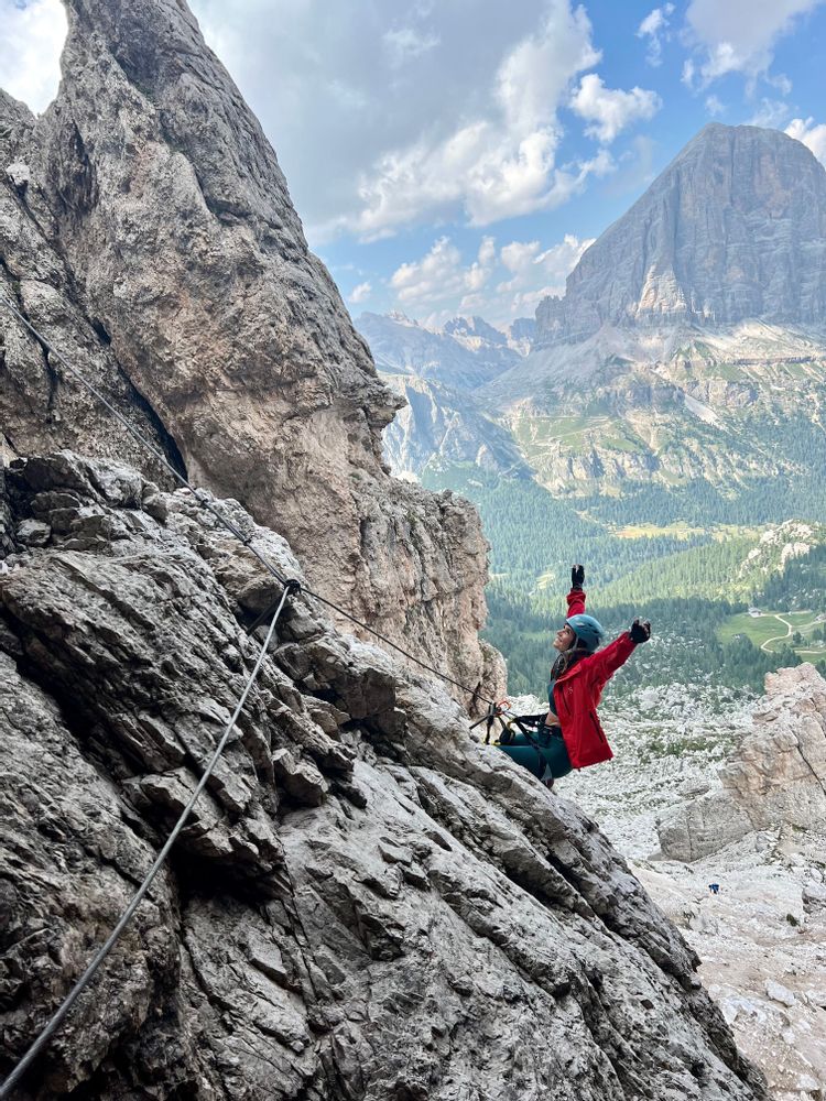 La Via Ferrata commence par une partie d’escalade peu difficile que j’ai personnellement adorée, à la verticale, mais avec de bonnes grosses prises qui rassurent et mettent en confiance. Au bout de 20-30 minutes de Via, on arrive dans un paysage avec de nombreux cailloux et un petit sentier qui mène jusqu’au sommet du Roc d’Averau, où se trouve une grosse croix. La vue est incroyable et on aperçoit à l’horizon les différentes montagnes environnantes : Pelmo, Civetta, Antelao, Sorapis, les Cinque Torri et Tofana di Rozes.
